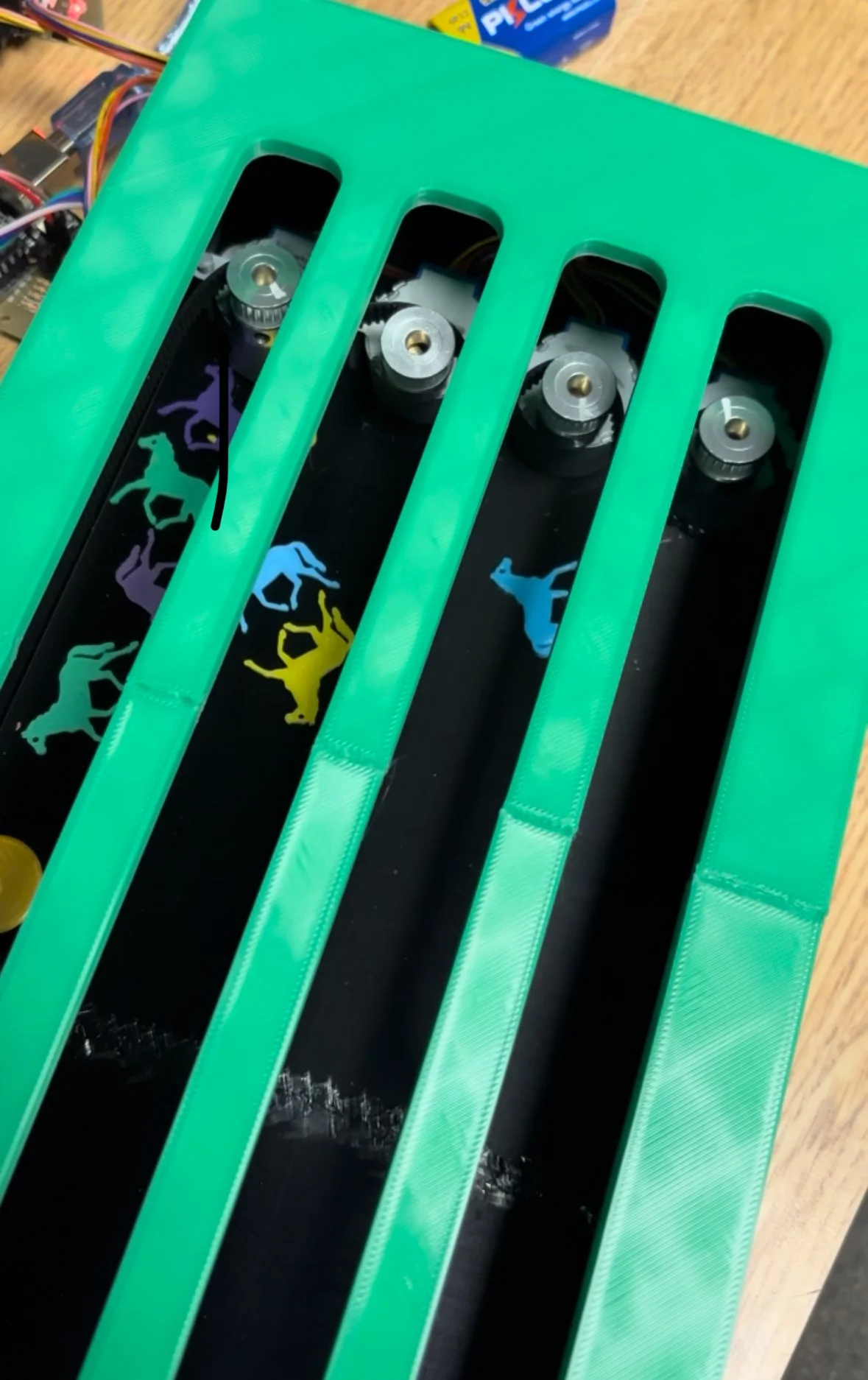 We had a “horse racing” track that was controlled by 4 servos that moved a plastic horse along the track. Each horse was calculated to have specific odds and payouts, with certain horses choosing their speeds for a higher option array than others. These speeds were changed every few seconds to offer random motion within the horses. Below is an image of the horsetrack prior to installing the horses on the chains, though unfortunately no videos of photos the final product seem to exist